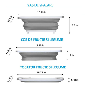 Tocatorul multifunctional va ofera suportul de care aveti nevoie in bucatarie pentru a prepara cele mai gustoase mancaruri.Cu un design modern, acesta este perfect si se poate depozita in bucataria dumneavoastra, facand astfel economie de spatiu.Este portabil atat pentru a putea fi folosit in interiorul casei cat si in exterior, cum ar fi calatorii, rulote, camping, drumetii, canotaj, pescuit, plaja, gradina, picnic, gratar.Acesta mai poate fi folosit ca recipient pentru depozitarea anumitor sticle sau alimente.Mai poate fi folosit ca un simplu tocator de legume, fructe, carne sau verdeata sau poate fi folosit ca vas pentru spalarea acestora. Pentru a scurge apa din el, puteti utiliza dopul cu care este prevazut, printr-o simpla desurubare.Se poate adapta foarte usor necesitatilor dumneavostra datorita celor doua trepte de pliere.Material PP + plastic durabilDimensiune acoperire : aproximativ 40x30x3cm.Culoare: alb/gri