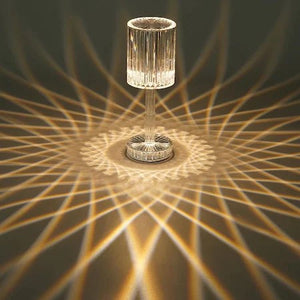 Lampa decorativa cu design stil cristal si iluminare alba, cu suprafata tactila pentru pornire/oprire. Baterie reincarcabila cu o autonomie de pana la 5 ore