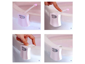 Usor de instalat si extrem de util pentru toate categoriile de varsta, de la copii la varstnici, noul dispozitiv LED pentru vasul de toaleta iti ofera, atunci cand este activat gratie senzorului infrarosu, clipe de confort si siguranta in propria baie. Atunci cand este activat noaptea, dispozitivul LED lumineaza intr-un mod placut vasul de toaleta, fara sa irite ochii asa cum ar face-o un bec aprins in toiul noptii. Caracteristici:-senzor de lumina si senzor de miscare;-LED-ul se aprinde doar daca in incapere este intuneric si este detectata miscare;-LED-ul se aprinde in 8 culori, fiecare culoare dureaza aproximativ 15 secunde;-2 setari de iluminare: o singura culoare sau schimb de culori (fiecare culoare dureaza aproximativ 15 secunde);-material: plastic;-usor de curatat;-perfecta pentru toaleta de acasa, pentru restaurante, cafenele, cluburi, etc;-voltaj: 4.5V;-putere: 1W;-functioneaza cu 3 baterii AAA (neincluse);-senzorul functioneaza pe o distanta de pana la 2m;-dimensiuni: 6.8*6.7*1.7cm;-rezistent la apa.