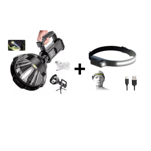 Lanterna puternica, 500 m, cu incarcare USB si trepied + Lanterna de cap cu acumulator cu senzor de miscare