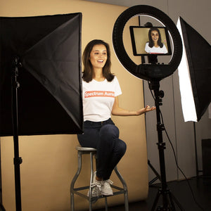 Lampa circulara Ring Light, 120 x LED SMD, 3 tipuri de lumina, 10 trepte de intensitate, telecomanda pe fir, trepied si suport pentru telefon inclus.