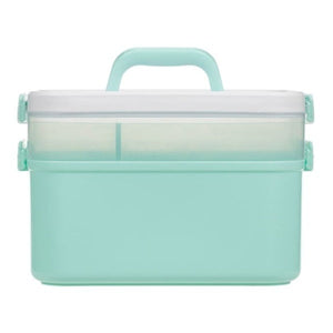 Cutie de depozitare si organizare pentru articole de cusut din plastic, de culoare verde menta, cu capac alb, maner de transport si cu inchidere.
