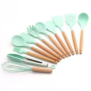 Set 11 ustensile din silicon, pentru gatit, manere bambus