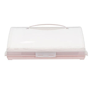 Suport dreptunghiular din plastic  (BPA FREE), cu baza roz, capac transparent pentru a va pastra chechul/cozonacul proaspat, cu maner pentru transport si inchidere in 4 puncte. Potrivit pentru congelator.