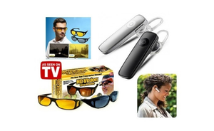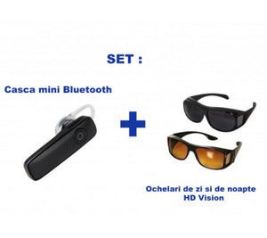 Oferta contine:1 x Casca Bluetooth 1 x Set 2 perechi ochelari zi si noapte Casca bluetooth cu atasament dupa ureche detasabil, silicon de protectie interior ureche, cablu incarcator usb tip microusb.Compatibil cu orice telefon. Specificatii:- versiune Bluetooth  4.1 mod:hfp1.6,hsp1.2,a2dp1.2,avrcp1.4- timp convorbire 6 ore- standby pana la 120 ore- timp de încarcare de 2 ore- raza de actiune: maxim 10m- calitate clara a sunetului- reducerea zgomotului de fundal- design atractiv- model subtire si usoara  - culori disponibile: alb sau negru (in functie de stoc)Casca Bluetooth -  este perfecta pentru smartphone-uri ! Dispune de functia DeepSleep™ care ne ajuta sa reducem consumul bateriei. Cele doua microfoane reduc zgomotul si vantul, astfel incat apelurile sa fie clare, ridicandu-se la cele mai inalte standarde de calitate!  Puteti asculta muzica, radio pe Internet si altele.   Set 2 perechi ochelari de condus de zi si de noapte Ochelarii sunt prevazuti cu protectie UV, acesti ochelari model HD reprezinta un mare avantaj pentru cei cu ochii sensibili.Tehnologia HD  va ofera o claritate pe care nu ati mai experimentat-o pana acum. Ochelarii pot fi folisiti ca ochelari de soare pentru ca lentilele sale colorate ofera protectie UVA si UVB pentru ochii dumneavoastra. Ochelarii  ofera protectie maxima datorita lentilelor sale High Definition.Prevazuti cu protectie contra razelor UV, acestia reprezinta un mare avantaj pentru cei cu ochii sensibili. Au definitie mare, camp vizual largit, protectie pentru vedere laterala, oferind o culoare calda si relaxanta.   Pachetul contine: 1 x ochelari zi; 1 x ochelari noapte