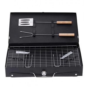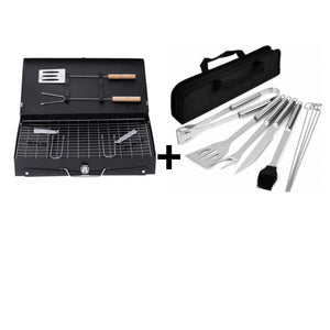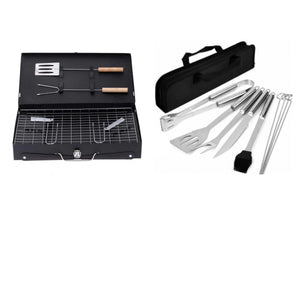 Gratar portabil pentru camping tip diplomat + Set 9 ustensile gratar cu geanta pentru depozitare