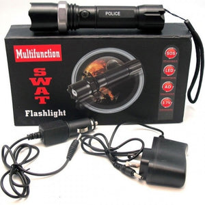 Lanterna multifunctionala Swat are 3 functii, una din ele fiind functia de SOS. Apasand butonul on / off prin atingere usoara veti activa flashuri de avertizare, in cazul in care v-ati ratacit, ati fost atacat, etc.Lanterna Tactical Swat poate fi reincarcata atat la priza 220V cat si la priza auto.  Specificatii tehnice lanterna Swat:·                     design ergonomic;·                     greutate 125g;·                     usor de utilizat;·                     bec 3W;·                     baterie 4800mAh, 3.7V li-ion;·                     indicator LED;·                     18000 lumeni; Pachetul lanterna Swat contine:·                     incarcator pentru priza;·                     incarcator bricheta pentru masina;·                     lanterna Swat;·                     snur pentru prindere;·                     baterie reincarcabila;·                     cutie depozitare si transport.